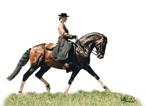 Eleganter Lusitanohengst mit überdurchschnittlichen Bewegungen in allen Grundgangarten, besonders im Trab. Ausgebildet in Dressurlektionen bis Grand Prix, Siege in Dressurprüfungen bis Klasse S.